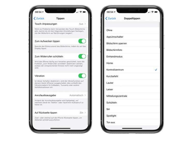 Um die Funktion einzurichten, öffnest du die Einstellungen-App und tippst dann auf „Bedienungshilfen > Tippen“. Dort findest du am unteren Ende den neuen Eintrag „Auf Rückseite tippen“ vor. Tippe darauf und wähle dann aus, ob du „Doppeltippen“ oder „Dreimal tippen“ aktivieren möchtest. Wähle nun eine Aktion aus.