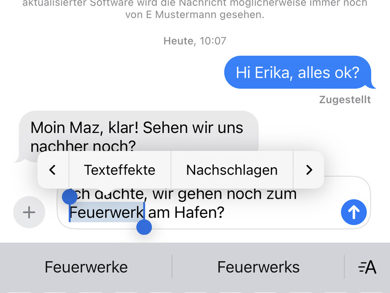 Danach kannst du weiterschreiben oder einen anderen Textteil markieren und den Vorgang wiederholen. Bist du fertig, tippe auf die blaue Taste zum Versenden.