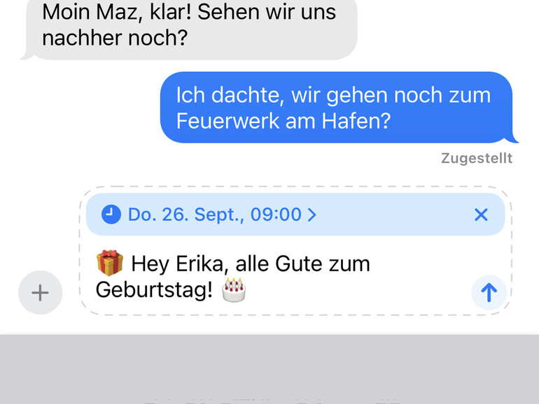 Eine einfache, aber praktische neue Funktion ist der zeitversetzte Versand. Nach Mail lernt nun auch Nachrichten, seinen Beiträgen einen Zeitpunkt für das Verschicken hinzuzufügen. So bekommt der Empfänger nicht mehr mit, wann du die Nachricht tatsächlich geschrieben hast. Außerdem kannst du wichtige Termine wie Geburtstage nicht mehr verpassen, indem du die Glückwünsche bei Gelegenheit schon etwas früher schreibst.