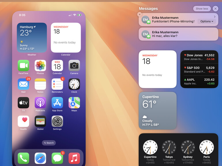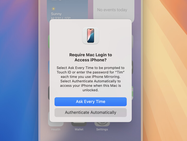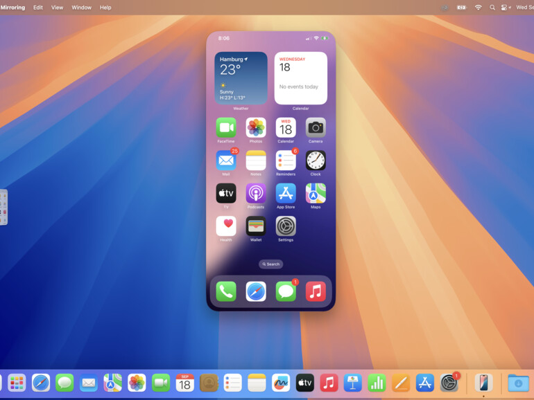 Der Start der iPhone-Spiegelung ist erfreulich unspektakulär. Das iPhone liegt in Bluetooth-Reichweite vom Mac. Nachdem auf beiden Geräten die neuesten Systeme laufen und die gleiche Apple-ID aktiviert ist, starten wir auf dem Mac das Programm iPhone-Mirroring. Nach einer kurzen Information zur Funktion erkennt es das iPhone und fordert dazu auf, es zu entsperren. Dann fragt es noch, ob es Mitteilungen des iPhone auf dem Mac anzeigen darf und fragt sicherheitshalber noch einmal das Mac-Passwort ab. Das passiert wahlweise einmal oder bei jeder neuen Verbindung. Anschließend erscheint der Bildschirm des iPhone in einem Fenster auf dem Mac, während das Gerät selbst im Sperrzustand bleibt. Versucht der Mac eine Verbindung aufzubauen, während das iPhone entsperrt ist, erscheint eine entsprechende Fehlermeldung. Die gleichzeitige Nutzung auf dem Gerät und in der Mac-App ist nicht möglich.
