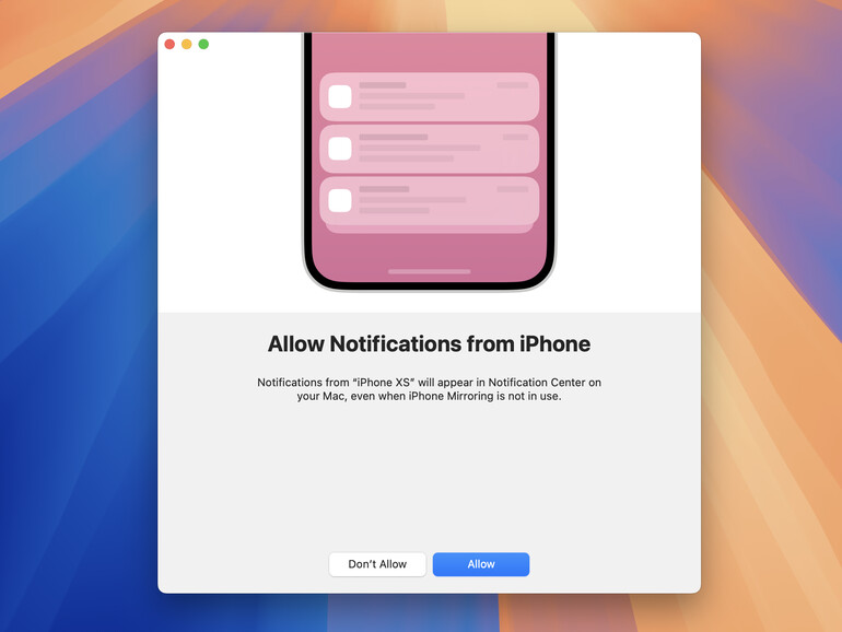 Die App führt durch die Verbindungsaufnahme und fragt dabei, ob du Mitteilungen vom iPhone auf dem Mac erhalten willst. Das klappt übrigens auch ohne aktive Spiegelung.