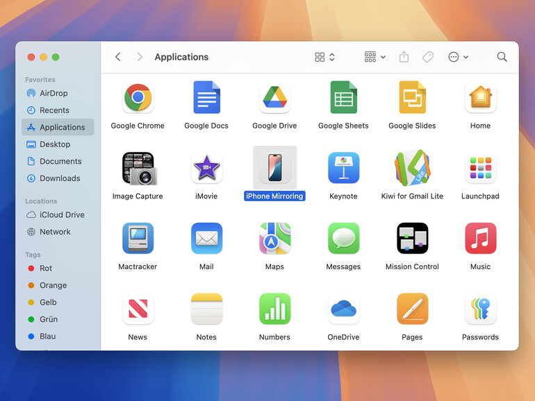 Sind Bluetooth, WLAN und die gleiche Apple-ID auf beiden Geräten aktiv, öffnest du auf dem Mac den Ordner Programme und startest die App „iPhone Mirroring“.