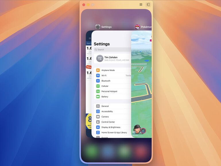 Das iPhone lässt sich nun mit Trackpad oder Maus bedienen. Das ist etwas gewöhnungsbedürftig, funktioniert aber zuverlässig. Wir können problemlos die Bildschirme auf dem iPhone zur Seite wischen, Apps starten und bedienen. Über zwei Tasten am oberen Fensterrand lassen sich jederzeit der Home-Bildschirm und der App-Umschalter aufrufen. So lässt sich das iPhone gut nutzen.