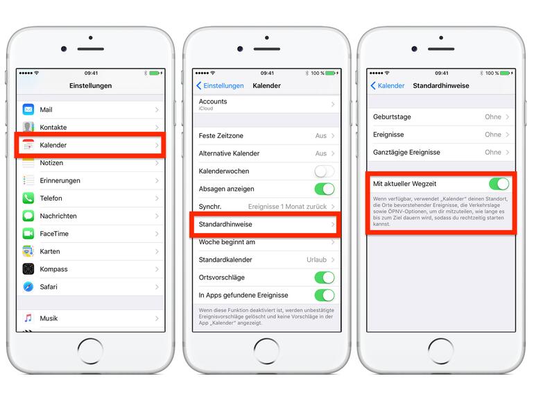 Nehmen Sie Ihr iPhone zur Hand und öffnen Sie die Einstellungs-App. Scrollen Sie nach, bis Sie den Menüpunkt „Kalender" sehen. Wählen Sie „Kalender" aus. Tippen Sie nun auf „Standardhinweise". Ziehen Sie den Schieberegler neben „Mit aktueller Wegzeit" nach rechts, um die Funktion zu aktivieren. Sie können die Einstellungs-App nun wieder mit einem Druck auf die Home-Taste verlassen.