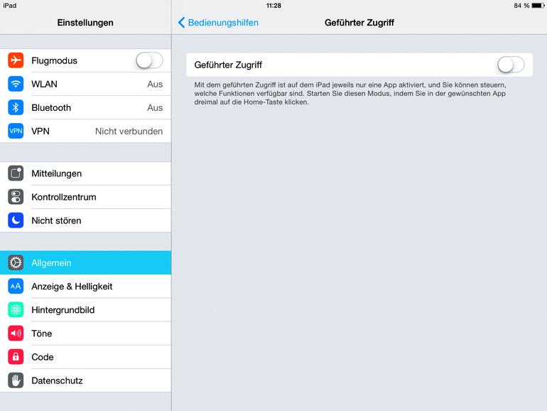 Aktivieren Sie zunächst die Option „Geführter Zugriff“. Diese finden Sie unter „Einstellungen > Allgemein > Bedienungshilfen“. Starten Sie eine App und drücken Sie dreimal schnell nacheinander die Home-Taste.