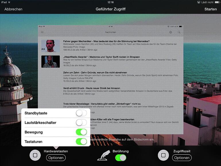 Haben Sie den Zugriff auf eine App begrenzt, ist es nicht möglich, diese zu beenden und zu einer anderen App zu wechseln. Optional deaktivieren Sie auch die Funktion des Ein/Aus-Schalters, der Lautstärketasten, die Bewegungssensoren und Tastaturen. Zudem ist es möglich, einige Bereiche des berührungsempfindlichen Displays gezielt zu deaktivieren. Das gibt Ihnen die Möglichkeit, virtuelle Tasten und Eingabefelder zu blockieren. Möchten Sie auf dem iPad nur etwas zeigen und wollen alle Eingaben komplett unterbinden, schalten Sie die Reaktion des Displays komplett ab.