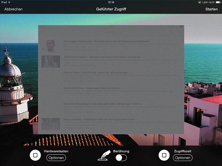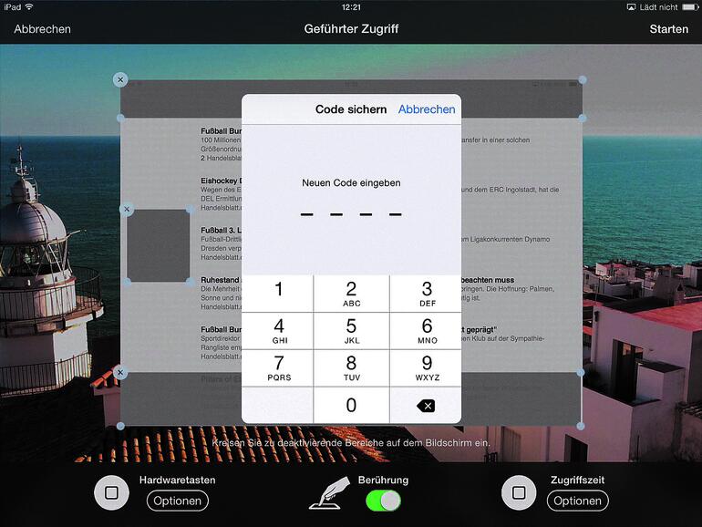 Bei geführtem Zugriff zeigen graue Flächen die gesperrten Bereiche an. Ist der gesamte Bildschirm gesperrt, sehen Sie das nicht. Dreimaliger Druck auf die Home-Taste plus Codeeingabe beenden den Modus.