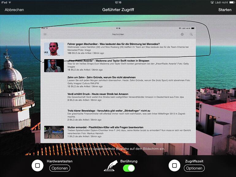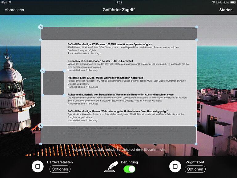 Sperren Sie einen oder mehrere Bereiche gezielt. An diesen Stellen ignoriert das iPad später die Berührungen. Schritt 1: