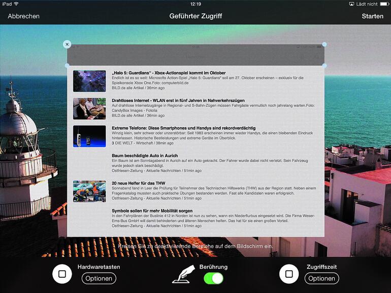 Möchten Sie einige Bereiche des Bildschirms berührungsunempfindlich machen, kreisen Sie diese einfach mit dem Finger ein. Wenn Sie den Finger absetzen, erscheint die entsprechende Fläche mit begradigten Linien. Der innere Bereich ist angegraut und zeigt die Stelle an, an dem der Bildschirm nicht mehr reagieren wird. Sie können mehr als eine solcher Flächen anlegen. Alle lassen sich verschieben und in der Größe verändern. Zum Verschieben tippen Sie auf die Fläche und schieben Sie diese an die gewünschte Position. Zum Verändern von Größe und Form berühren Sie einen der kleinen grauen Punkte und ziehen Sie ihn in die gewünschte Richtung. Sind Sie zufrieden, klicken Sie „Starten“. Ab sofort sind Ihre Daten geschützt und die Bedienung auf nur eine App reduziert. Im Workshop auf der nächsten Seite sehen Sie in einer Schritt-für-Schritt-Anleitung, wie Sie den geführten Zugriff nutzen können.