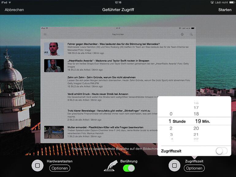 Wenn Sie den geführten Zugriff starten, erscheint ein Konfigurationsmenü. Darin sehen Sie vor Ihrem Hintergrundbild ein verkleinertes Abbild des App-Bildschirms. Darunter finden Sie die Optionen für die Hardware-Tasten. Mit Ihnen schalten Sie die Funktion einzelner Schalter am Gehäuse ein oder aus. Mit der Option „Berührung“ schalten Sie die Bildschirmeingabe komplett ab. Über die Option „Zugriffszeit“ stellen Sie ein, wie lange die App und damit das iPad nutzbar ist. Nach Ablauf der Zeit wird das iPad gesperrt. Es lässt sich dann nur durch Eingabe des Codes reaktivieren.