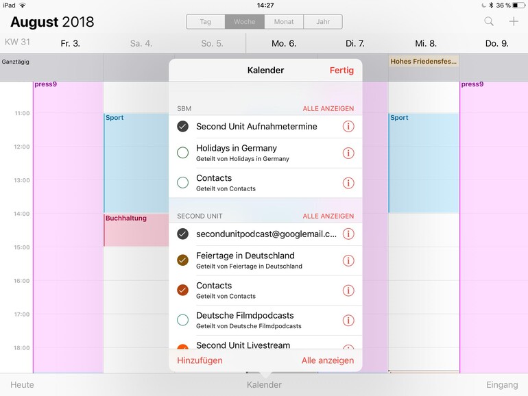 Eine der nützlichsten Funktionen der Kalender-App zeichnet diese bereits seit der ersten Version aus: das Anlegen und die Verwaltung mehrerer verschiedenen Kalender. So verwalten Sie alle wichtigen Termine in eigenen Ansichten: Beruf, Privates, Projekte, Familie und was Ihnen noch so einfällt. Jedem Kalender können Sie außerdem eine eigene Farbe zuordnen. Somit sehen Sie sofort, wann welche Themen wie stark im Fokus Ihrer Aufmerksamkeit stehen.