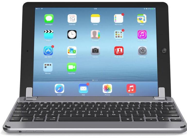 Wer bei der Tastatur gerne das gleiche Material hätte wie beim iPad Air selbst, ist ein Kandidat für die Brydge Air: Die Tastatur kommt aus sehr solide wirkendem Aluminium und mit einem Tippgefühl, das fast schon an ein Macbook erinnert und auf keinen Fall Plastikhaptik versprüht. Das iPad Air (1 oder 2) wird in zwei Scharniere eingeschoben und lässt sich dann stufenlos in einem Winkel von 0 bis 180 Grad verstellen. Die Tasten sind dezent beleuchtet. Für satten Sound sorgen zwei in die Tastatur eingebaute Stereolautsprecher, die dem sonst flachen Klang des Air wirklich guttun. Im Normalbetrieb soll das batteriebetriebene Bluetooth-Keyboard bis zu drei Monate durchhalten, dann reicht eine kurze Ladung über USB.