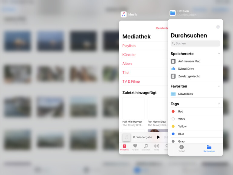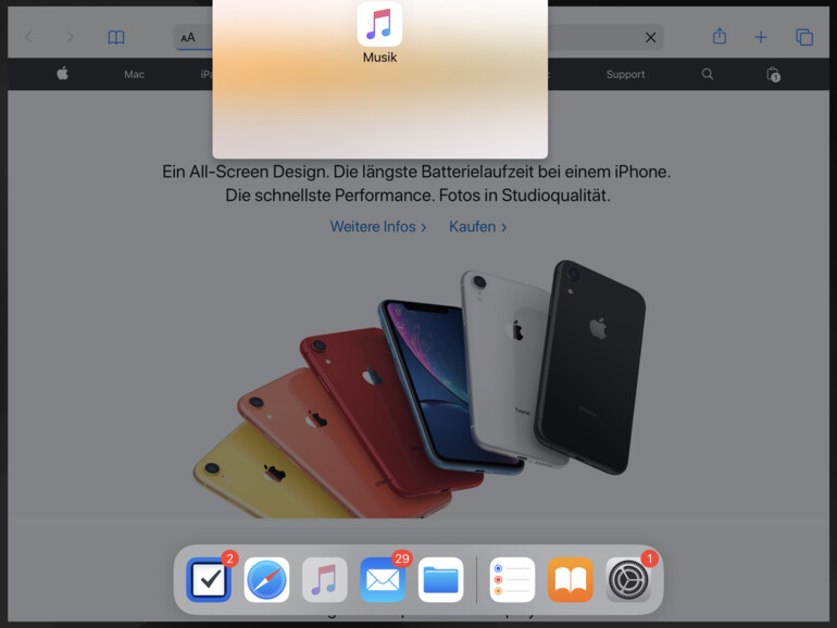 Um eine App im Multitasking zu öffnen, rufen Sie zunächst eine der beiden Anwendungen auf. Wischen Sie dann mit dem Finger vom unteren Bildschirmrand leicht nach oben, um das Dock anzuzeigen. Ziehen nun eine App aus dem Dock über die geöffnete Anwendung, öffnet sich ein verkleinertes Fenster mit dem Programm. Wiederholen Sie dies mit einer weiteren App. Wie auch beim iPhone können Sie am unteren Rand zwischen den geöffneten Slide-Over-Apps wechseln. Wischen Sie jedoch nach oben, dann werden Ihnen sämtliche Apps angezeigt.