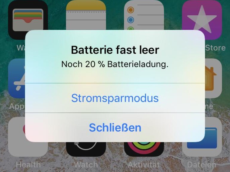 Bei 20 Prozent Restladung zeigt iOS die erste Warnung und bietet an, den Stromsparmodus zu aktivieren und dadurch die verbleibende Laufzeit zu verlängern. Bei 10 Prozent Restladung folgt eine zweite Warnung.