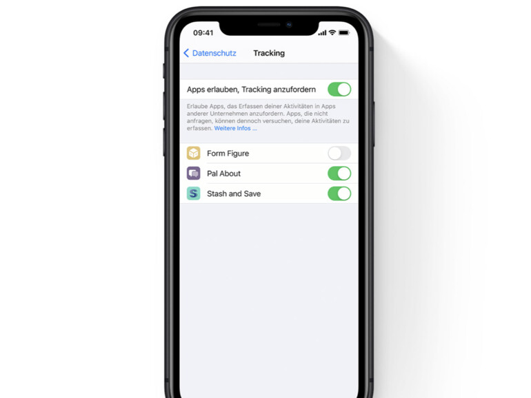 Öffne dazu die Einstellungen-App. Scrolle etwas nach unten und rufe den Eintrag „Datenschutz“ auf. Tippe dort gleich oben auf „Tracking“ und ziehe den Regler neben „Apps erlauben, Tracking anzufordern“ nach links, um das Erfassen deiner Aktivitäten zu verhindern. Allerdings versäumt es Apple, dich an dieser Stelle über das Feature umfassend zu informieren. Dies geschieht erst, wenn du darunter auf „Weitere Infos“ tippst.
