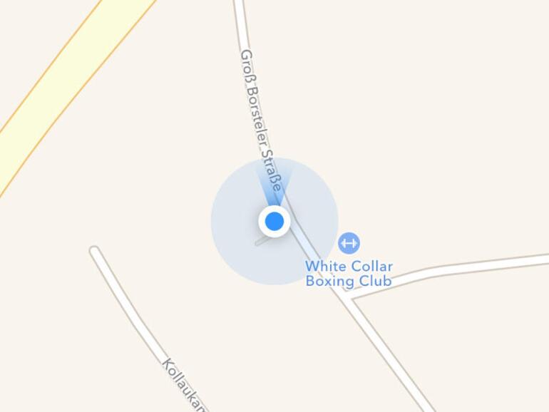 Tippen Sie unten auf den Pfeil, um die aktuelle Position in die Mitte zu rücken oder die Karte in Blickrichtung auszurichten. Tippen Sie auf den kleinen Kompass oben rechts, um die Karte nach Norden auszurichten.