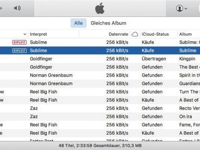 Falls du iTunes Match gebucht hast, gibt es eine einfache Möglichkeit, alte MP3-Dateien in schlechter Qualität in moderne AAC-Files aus dem iTunes-Store umzuwandeln: Wähle einfach den „iCloud-Status“, „iCloud-Download“ sowie „Datenrate“ und schaue, welche Songs als „Gefunden“ markiert sind, die eine „krumme“ Datenrate haben oder eine, die nicht 256 KBit/s ist. Diese Songs sind in aller Regel MP3s minderer Qualität, die du gegen hochwertige iTunes-AACs austauschen kannst, indem du sie löschst und den Lösch-Dialog „Download entfernen“ wählst. Der Song wird anschließend mit einem kleinen Download-Symbol markiert: Klicke es an, um dem Song in bester iTunes-Qualität neu herunterzuladen – natürlich ohne zusätzliche Kosten!