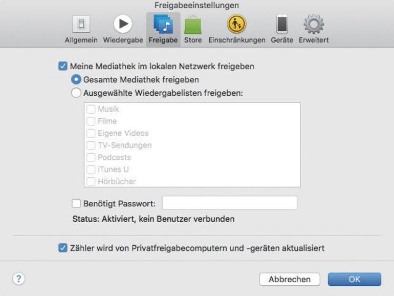 Wenn du im Haushalt mehrere Macs hast, ist es sinnvoll, die iTunes-Mediathek auf einem Gerät zu pflegen und von dort aus allen anderen Rechnern freizugeben. Öffne auf dem Gerät die iTunes-Einstellungen und wähle den Reiter „Freigabe“: Hier kannst du einen Haken bei „Meine Mediathek im lokalen Netzwerk freigeben“ setzen und entweder alles („Gesamte Mediathek freigeben“) oder ausgewählte Wiedergabelisten freigeben.