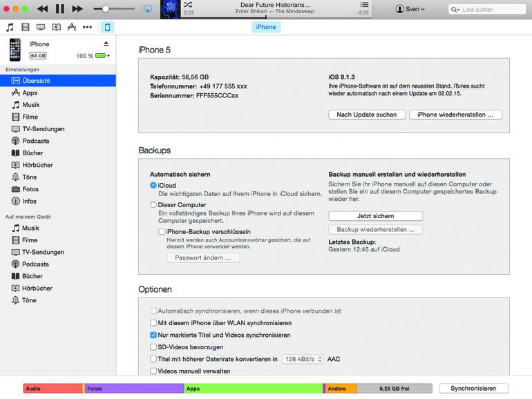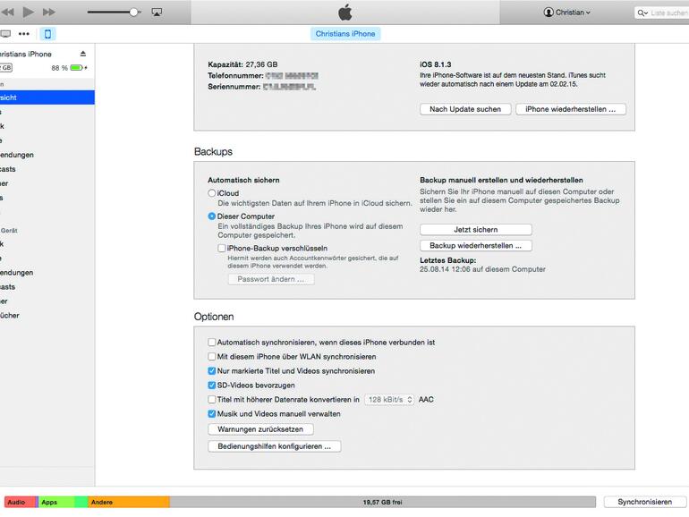 Im obersten Bereich der Übersicht befinden sich Informationen zu Ihrem aktuell angeschlossenen iPhone oder iPad. So sehen Sie hier die Gesamtspeicherkapazität des Geräts, bei iPhones und iPads mit Mobilfunkanbindung die Telefonnummer der SIM-Karte oder die Seriennummer des Geräts. Direkt rechts daneben findet sich die aktuelle iOS-Version, die Ihr Gerät nutzt. Sollte eine Aktualisierung für iOS verfügbar sein, meldet iTunes Ihnen das schon beim anstecken an iMac oder MacBook. Sie können aber auch jederzeit an dieser Stelle manuell nach Updates suchen.