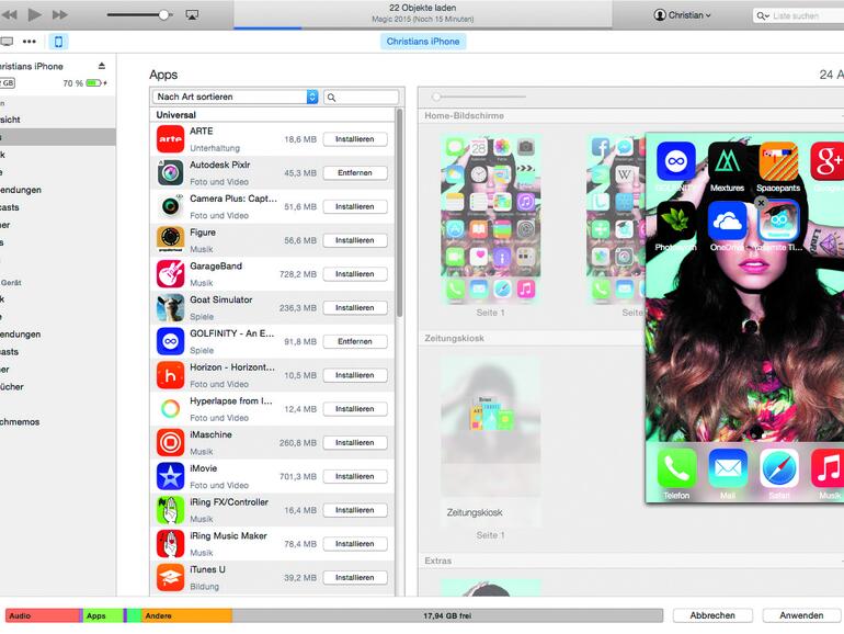 In der linken Seitenleiste finden Sie einmal die Einstellungen für alle Bereiche von iTunes, nach Medienart sortiert, und darunter ebenso kategorisiert alle Medien auf Ihrem angeschlossenen iOS-Gerät. Unter Apps werden alle Ihre auf iPhone und iPad gekauften Apps gelistet, die iTunes automatisch auf Ihrem Mac speichert. Hier können Sie auch die Anordnung der Apps auf dem Bildschirm Ihres iOS-Geräts ändern. Das ist besonders praktisch, da dieser Vorgang auf dem iPhone oder iPad gerade bei vielen installierten Apps schnell in Frustration ausarten kann. Um eine App von einem Home-Bildschirm zu einem anderen zu verschieben, klicken Sie den jeweiligen Home-Bildschirm mit einem Doppelklick an. Dann ziehen Sie das Symbol der App, die verschoben werden soll mit gehaltener Maustaste an die Stelle, die Sie sich ausgesucht haben. Haben Sie eine App wie die Textverarbeitung Pages oder Apples Musiksoftware Garageband installiert, so können Sie hier auch Projekte und Dateien zwischen Ihrem Mac und dem iOS-Gerät austauschen.