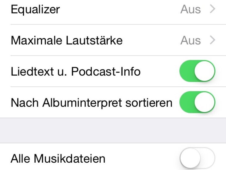 Bei einer großen Musik-Sammlung kann die Übersicht auf dem iPhone schnell verloren gehen. Mit iTunes Match haben Sie nämlich Zugriff auf Ihre komplette Mediathek. Sie können aber auch nur die Titel und Alben anzeigen, die auf Ihrem iPhone oder iPad geladen sind. Gehen Sie dazu in die Einstellungen und deaktivieren Sie unter Musik den Zugriff auf Alle Musikdateien.