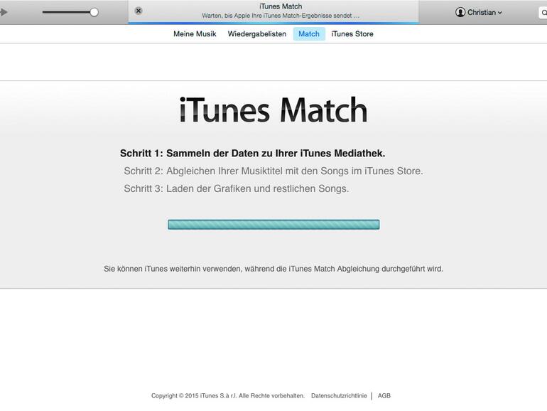 Nach dem Aufräumen Ihrer Musik-Sammlung wechseln Sie in den iTunes Store. Dort finden Sie in der Musik-Rubrik die Kaufoption für iTunes Match in der rechten Spalte. Den Kauf einer Jahresgebühr von iTunes Match tätigen Sie mit Ihrer Apple-ID, mit der Sie auch Ihre sonstigen iTunes-Einkäufe bezahlen. Nach dem Bestätigen der Nutzungsbedingungen aktiviert iTunes Match die Einrichtung in drei Schritten. Zunächst scannt das Programm Ihre Musiksammlung. Im zweiten Schritt wird das Ergebnis mit dem iTunes-Musik-Katalog vergleichen. Im dritten und letzten Schritt lädt die Anwendung anschließend alle Titel in die iCloud, die nicht im iTunes Store gefunden wurden. Dies kann einige Stunden beziehungsweise Tage dauern, abhängig von der Größe Ihrer Musiksammlung und Ihrem Internet-Anschluss. Die einzelnen Schritte können unter Umständen ins Stocken geraten. Lassen Sie sich davon nicht beirren und versuchen Sie die Einrichtung gegebenenfalls erneut.