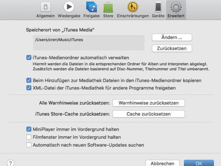Wenn Sie einen Mac mit wenig Speicher – etwa ein Macbook Air – besitzen, sollten Sie darüber nachdenken, Ihre ständig wachsende Musikmediathek auf einen externen Datenträger auszulagern. Das kann eine USB-Festplatte, ein USB-Stick oder eine bündig abschließende Speichererweiterung via SD-Karte sein. Werfen Sie dazu zunächst einen Blick in die iTunes-Einstellungen unter „Erweitert“: Hier ist der Speicherort Ihrer Songs angegeben.