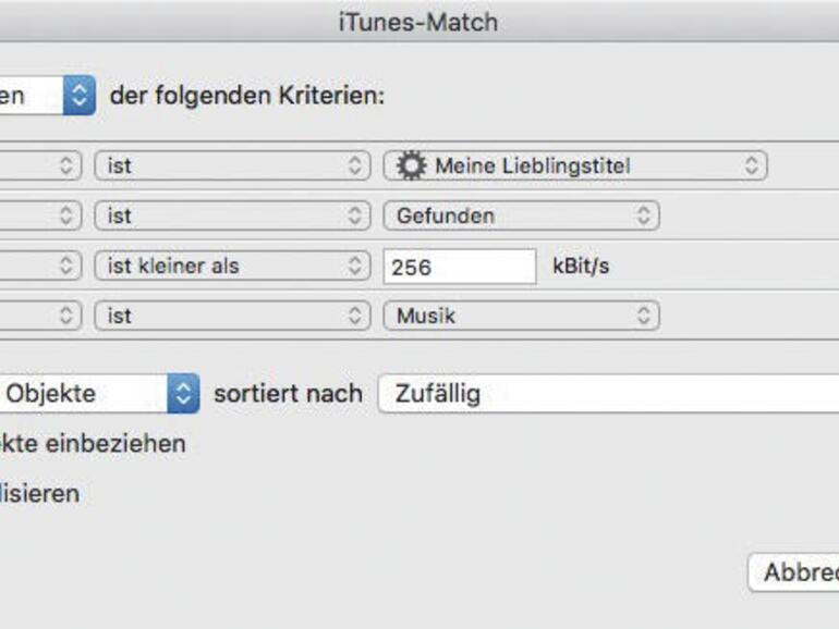 Intelligente Playlisten sind praktisch, da sich hier zahlreiche automatisierte Kriterien erstellen lassen, anhand derer Songs in iTunes sortiert werden. Eine automatische Playliste erlaubt zum Beispiel, alle Songs mit bestimmten Bitraten aufzuspüren, was Sie zum Beispiel wie im Bild nutzen können, um iTunes-Match-taugliche Songs aufzuspüren, die noch nicht per iTunes-Download verbessert wurden. Um noch genauer zu sortieren, können Sie zudem intelligente Playlisten verschachteln: Erstellen Sie zum Beispiel eine intelligente Playliste, die nur Songs der Band „The Who“ enthält und eine weitere, die diese Playliste als Basis nimmt („Wiedergabelist ist…“), um nur Songs im Bereich der Sechzigerjahre wiedergibt. Um das zu testen: Die zweite Playlist sollte nur Songs der Band The Who aus den 60ern enthalten. Durch geschickte Auswahl der Kriterien können Sie auf diese Weise mehrere Playlisten ineinander stapeln und erhalten so die perfekte Playliste, die wirklich all Ihren Kriterien entspricht.