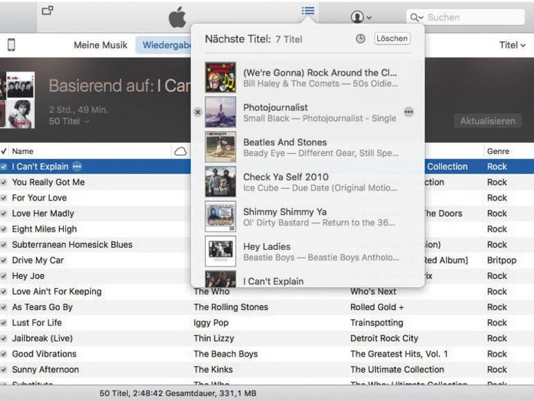Egal ob auf einer Party oder beim Musikhören zuhause: Manchmal hat man Lust, eine bestimmte Auswahl an Songs zu hören, ohne dafür aufwändig eine Playliste zu erstellen. Auch in solchen Fällen hilft iTunes: Spielen sie einfach einen Song ab und scrollen Sie durch Ihre Playlisten und Ihre Mediathek. Songs, die Sie heute noch hören wollen, schmeißen Sie per Rechtsklick in die „Auf Nächste-Titel-Liste“. Oben im iTunes-Fenster wird diese Liste angezeigt, wenn Sie auf das Listensymbol klicken.