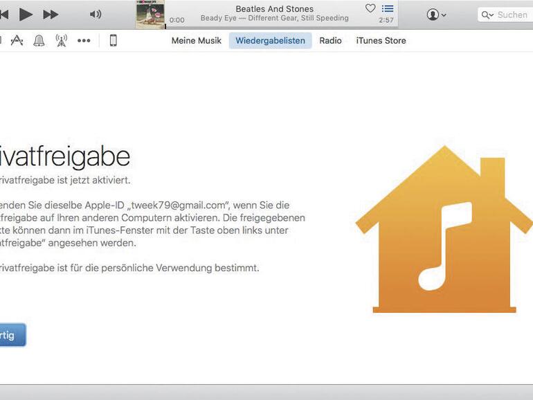 Wenn Zuhause mehrere Macs im Einsatz sind, haben diese vermutlich auch jeweils eigene Musik-Bibliotheken. Diese können Sie wiederum auf allen anderen Macs nutzen, die dafür vorgesehene Option ist die Privatfreigabe, mit der sich Mediatheken von bis zu fünf Macs im Netzwerk nutzen lassen: Klicken sie in der Menüzeile auf „Ablage“ und wählen Sie hier „Privatfreigabe -> Privatfreigabe aktivieren“. Hier müssen Sie nun auf allen Rechnern die gleiche zentrale Apple-ID angeben. Keine Sorge: Das hat nichts mit der iCloud oder der sonstigen Konfiguration zu tun. Anschließend können Sie die Mediatheken mehrerer Rechner verwenden.