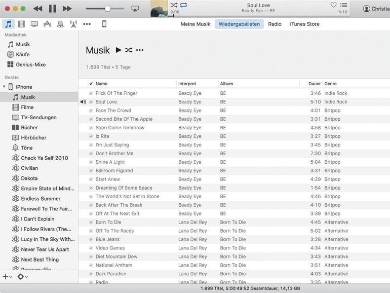 Wenn Sie auf der Arbeit einen iMac haben und Musik hören möchten, aber Ihre Songs nicht per USB-Stick auf den Mac übertragen möchten, können Sie das iPhone einfach an den Rechner anschließen und die Musik von dort abspielen: Öffnen Sie dazu den Punkt „Wiedergabelisten“ in iTunes und wählen Sie links in der Spalte das angeschlossene iPhone aus. Anschließend können Sie eine Playliste auswählen und mit einem Klick auf den „Play“-Knopf abspielen. Leider lassen sich Songs nicht direkt auswählen, vielmehr funktioniert das ähnlich einem CD-Player: Sie können innerhalb der Playlisten nur vor- und zurückspringen, eine Direktauswahl ist leider nicht möglich.
