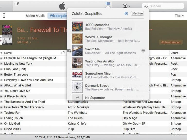 Da lief doch eben ein Song in iTunes, den Sie richtig gut fanden… aber Sie können sich partout nicht mehr erinnern, welcher das war, nicht einmal den Refrain könnten Sie singen? Kein Thema: iTunes führt automatisch Buch über die zuletzt gespielten Songs. Auch hier hilft die Nächste-Titel-Liste: Klicken sie diese an, um die nächsten Songs zu zeigen und drücken Sie dann auf das Uhren-Symbol: iTunes zeigt Ihnen jetzt die zuletzt gespielten Songs in einer langen Liste an. Ein Doppelklick startet den Song. Links neben den Songs ist übrigens ein kleines „Nächste-Liste“-Symbol: Mit diesem können Sie den Song auch gleich wieder in die Einmal-Playliste übernehmen.