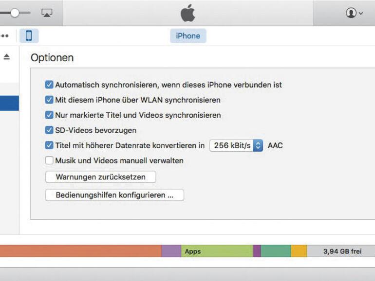 Auch iOS-Geräte beherrschen Lossless – die großen Dateien sind aber echte Speicherplatzvernichter. Schon deshalb sollten Sie bei der Synchronisation von iPhone und iPad darauf achten, dass dort nur komprimierte Songs überspielt werden. Dazu besitzt iTunes die praktische Funktion, Lieder vor dem Sync kleinzurechnen: Öffnen Sie dazu den iTunes-Dialog zur Synchronisation von iOS-Geräten: Unter „Optionen“ finden Sie die Möglichkeit, „Titel mit höherer Datenrate konvertieren in“. Haken Sie diese an und setzen Sie die Bitrate nach persönlichem Geschmack: 256 KBit/s für beste Audioqualität, 128 KBit/s für bestmögliche Speicherplatznutzung. Beim nächsten Synchronisationsvorgang rechnet iTunes die Dateien – auch Lossless – nur für das Endgerät ins AAC-Format um, wodurch Sie massiv Speicherplatz auf iPhone und iPod sparen können.