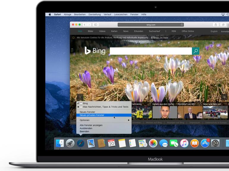 Die Funktion „Privates Surfen“ löscht deine Spuren in Safari. Böse Zungen sagen, das dient nur dem unbemerkten Besuch anzüglicher Websites, aber so einfach ist das nicht. Privates Surfen verhindert, dass die besuchten Seiten im Verlauf auftauchen oder offene Tabs über iCloud synchronisiert werden. Die privaten Tabs werden aber auch isoliert von anderen gehalten. Safari fordert Websites auf, nicht zu tracken, und löscht zwischengespeicherte Daten und Cookies nach dem Verlassen. Mit dem Befehl „Neues privates Fenster“ im Ablage- oder Dockmenü (Befehl-Umschalttaste-N) öffnest du ein geschütztes Fenster. Du erkennst den Modus am dunklen Eingabefeld. Zugehörige Daten werden beim Schließen gelöscht. Zu den Vorteilen zählen außerdem, dass die Inhalte nicht in den Suchvorschlägen oder der Bannerwerbung auftauchen, unerwünschte Cookies nicht manuell gelöscht werden müssen und Seiten nicht per Handoff an iPhone & Co übertragen werden.