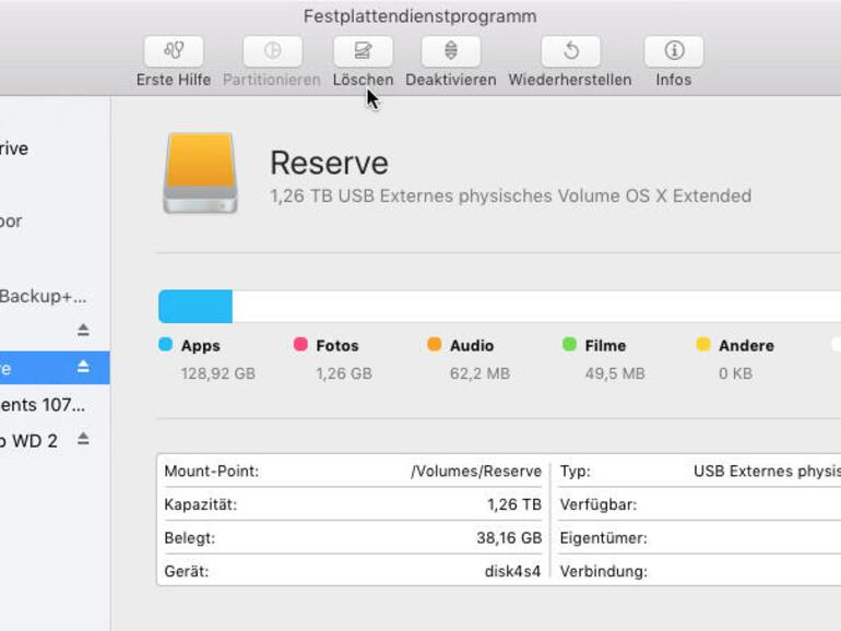 Gibt man eine Festplatte aus der Hand, will man meist nicht, dass alte Daten davon gefunden werden. Löscht man ein Volume, entfernt OS X aber nur das Inhaltsverzeichnis. Die eigentlichen Daten bleiben unverändert auf der Festplatte liegen, sodass sie sich mit Spezialtools wieder sichtbar machen lassen, wenn die entsprechenden Speicherbereiche noch nicht neu belegt wurden. Für Volumes mit vertraulichen Daten sollte man daher das „sichere Löschen“ verwenden. Hierzu öffnest du das Festplattendienstprogramm, markierst das Volume und wählst den Befehl „Löschen“. Es erscheint ein kleines Fenster, in dem du Name und Format ändern kannst.