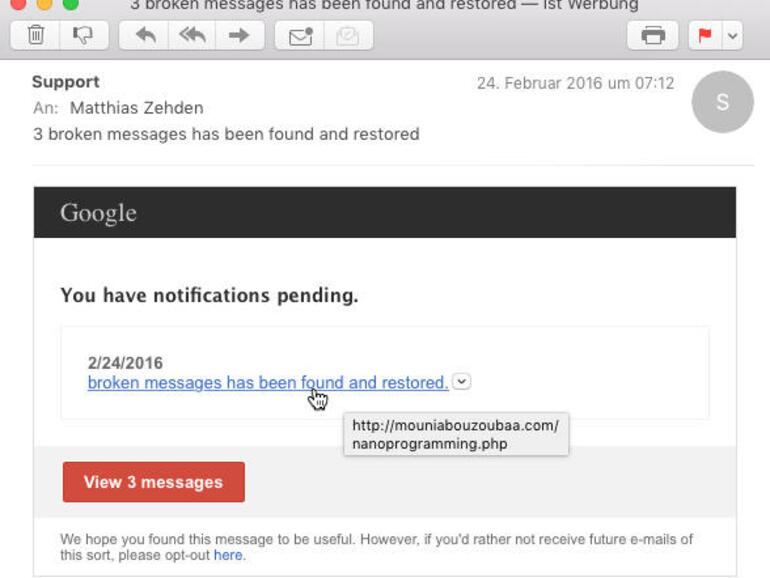 Die meisten Spam-Mails wollen dich auf manipulierte Webseiten locken oder zum Öffnen angehängter Dateien bringen. Wann immer du von Banken oder Händlern zu Account- und Rechnungsfragen angeschrieben wirst und unsicher bist, solltest du keinem Link in der Mail folgen, sondern selbst mit Safari die Firmenseite öffnen. Viele Mails erkennt man schnell als Fake, wenn man den Mauszeiger über einem Link stehen lässt.