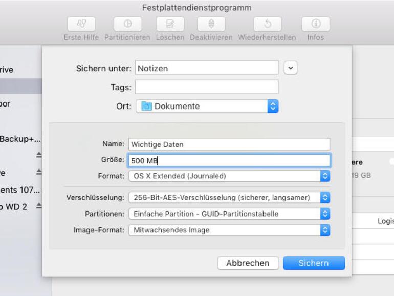 Oft ist es nicht nötig, gleich Ihr ganzes Benutzerkonto oder ein ganzes Volume mit FileVault zu verschlüsseln. Möchtest du nur einzelne Dateien sichern, leg am besten mit dem Festplattendienstprogramm ein verschlüsseltes Image an (Befehl-N). Gib Dateiname und Speicherort ein, dann die gewünschte Größe. Ein mitwachsendes Image belegt erst mit dem Füllgrad mehr Platz. Wähle dazu die Kodierung mit 256 Bit AES und ein gutes Passwort, einen kurzen Satz mit Zahlen und Sonderzeichen (nicht im Schlüsselbund speichern!).