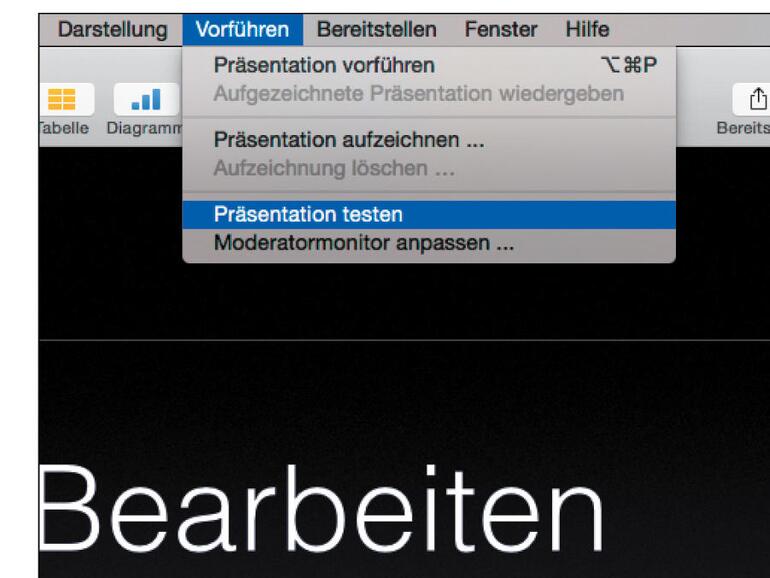 Nachdem du deine Präsentation erstellt hast, solltest du diese testen. Damit findest du letzte Fehler und kannst deine Präsentation üben. Dazu benötigst du noch nicht einmal einen zweiten Bildschirm. Klicke im Menü auf „Vorführen“. Anschließend wählst du „Präsentation testen“ aus. Es öffnet sich nun der Moderatormonitor auf deinem Mac-Bildschirm. Mit den Pfeiltasten deiner Tastatur navigierst du durch die Präsentation. Nachdem die Präsentation beendet ist, gelangst du automatisch zurück zu Keynote. Möchtest du den Test vorher beenden, drücke die [esc]-Taste.