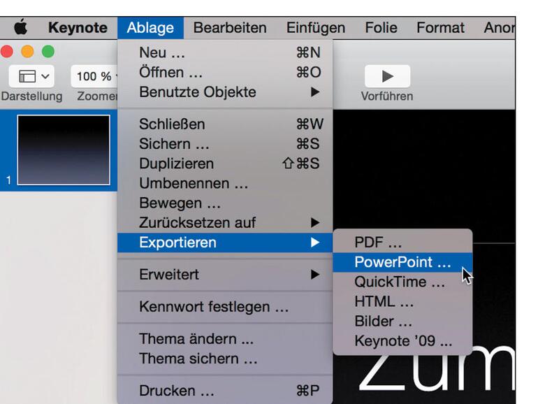 Nachdem du deine Präsentation erstellt hast, gilt es, diese vorzuführen. Aber nicht jeder Präsentationsort hat einen eigenen Mac. Du solltest deshalb deine Präsentation sicherheitshalber in andere Formate exportieren. Klicke auf „Ablage“ und dort auf den Punkt “Exportieren„. Du hast die Wahl zwischen verschiedenen Formaten. Mit PDF erstellst du eine PDF-Datei, die von allen gängigen Computern angezeigt werden kann. Mit QuickTime erstellst du ein Video. Für Microsoft-Computer benötigst du das PowerPoint-Format. Unter „Erweiterte Optionen“ entscheidest du dich für das passende Format.