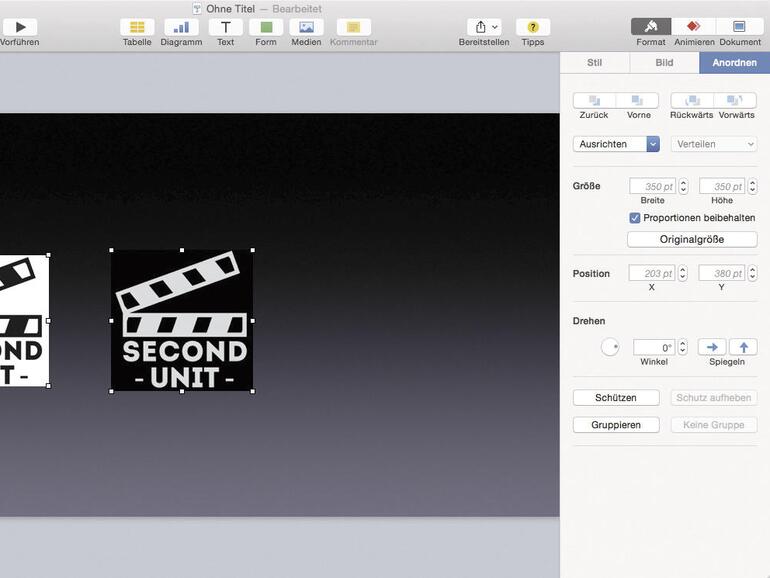 Du kannst mit Keynote auch mehrere Bilder oder Videos auf deine Folien hinzufügen. Dabei behandelt das Programm jede Datei einzeln. Das kann aber beispielsweise bei Animationen eher stören. Wenn du erst die linken beiden Bilder deiner Folie animieren möchtest und anschließend die rechten beiden, dann geht das mit einem Trick. Halte die [cmd]-Taste gedrückt. Anschließend klickst du auf deine beiden Bilder. Dadurch wählst du beide gleichzeitig aus. Danach klickst du in der rechten Spalte auf „Format“ > „Anordnen“. Mit dem Knopf „Gruppieren“ machst du aus den beiden Bild-Objekten eins.