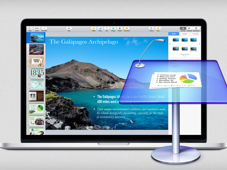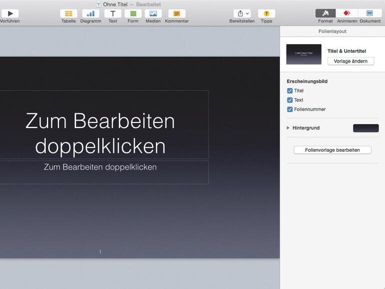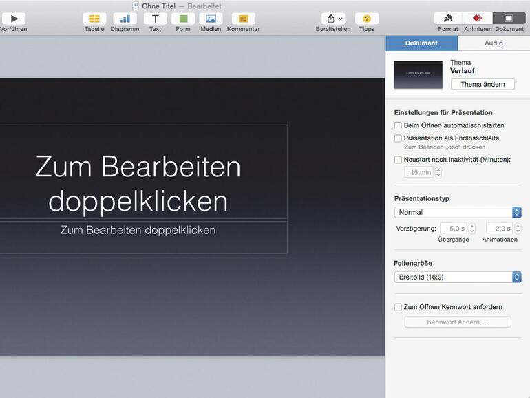 Für Keynote ist das Standard-Format das altbewährte Seitenverhältnis von 4:3. Das erzeugt besonders auf modernen Fernsehern oder Beamern aber störende Balken an den Rändern. Das kannst du ändern. Dazu navigierst du in der rechten oberen Ecke auf den Punkt „Dokument“. Hier findest du in der rechten Fenster-Spalte einen Punkt namens „Foliengröße“. Klicke auf den Balken und änder die Anzeige in das „Breitbild (16:9)“-Format. Über den Menüpunkt „Eigene Foliengröße“ kannst du das Format selbst einstellen. Dabei nutzt du Pixel-genaue Vorlagen für deine Präsentation.