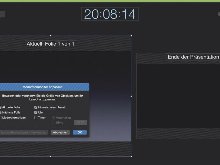 Der Moderatormonitor ist deine persönliche Ansicht während der Präsentation. Hier erhältst du im Gegensatz zu deinem Publikum weitere Anzeigen. Diese helfen dir bei der Präsentation. Über das Menü am oberen Bildschirmrand rufst du die Anzeige auf. Unter dem Punkt „Vorführen“ kannst du den Moderatormonitor anpassen und eigene Einstellungen vornehmen. In dieser Ansicht zeigt dir Keynote zum Beispiel die aktuelle, aber auch die nächste Folie an. Neben der aktuellen Uhrzeit kannst du auch einen Timer einblenden. Dieser zeigt entweder die verstrichene Zeit an. Oder sie legen einen Zeitraum fest und der Timer zählt rückwärts.