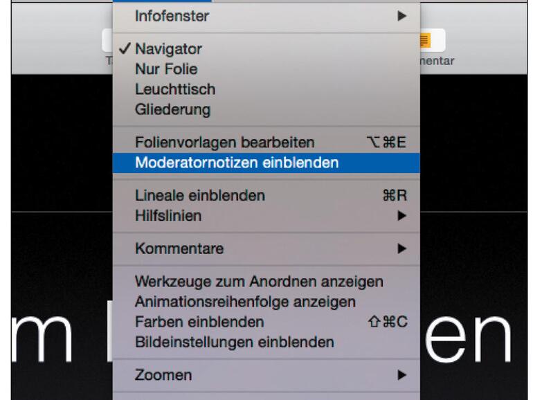 Eine der wichtigsten Funktionen für eine gelungene Präsentation sind die Moderatornotizen. Diese musst du zunächst aktivieren. Dazu klickst du im Menü auf „Darstellung“. Anschließend wählst du „Moderatornotizen einblenden“ aus. In der Keynote-Ansicht öffnet sich im unteren Bildschirm-Bereich ein weißes Fenster. Klicke auf diesen Bereich und leg hier Notizen an. Das ist besonders praktisch für eigenen Stichworte. Damit benötigst du keine analogen Karteikarten mehr. Diese Notizen sind während der Präsentation ausschließlich für dich zu sehen. Dein Publikum sieht weiterhin nur deine Folien.