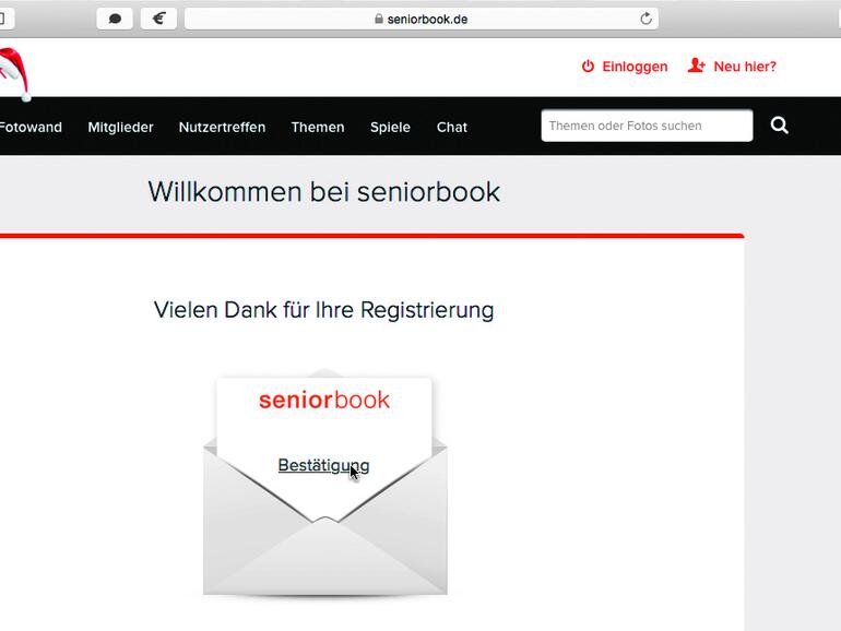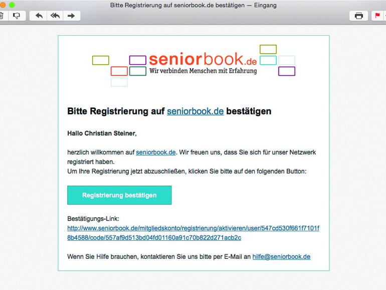 Bestätigungsmail erhalten: Nachdem Sie Ihren Namen, Ihre Mail-Adresse und ein Passwort angegeben haben, erhalten Sie eine E-Mail von Seniorbook zur Bestätigung.