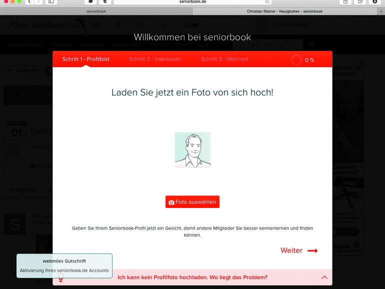 Foto auswählen: Sie werden anschließend zur Seniorbook-Seite geleitet. Hier ergänzen Sie Ihr Profil, zum Beispiel mit einem eigenen Nutzer-Foto von Ihrer Festplatte.