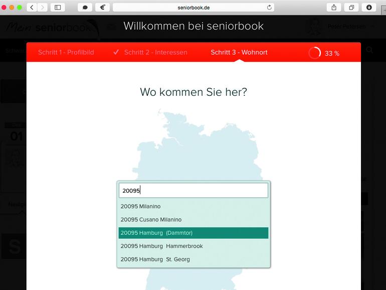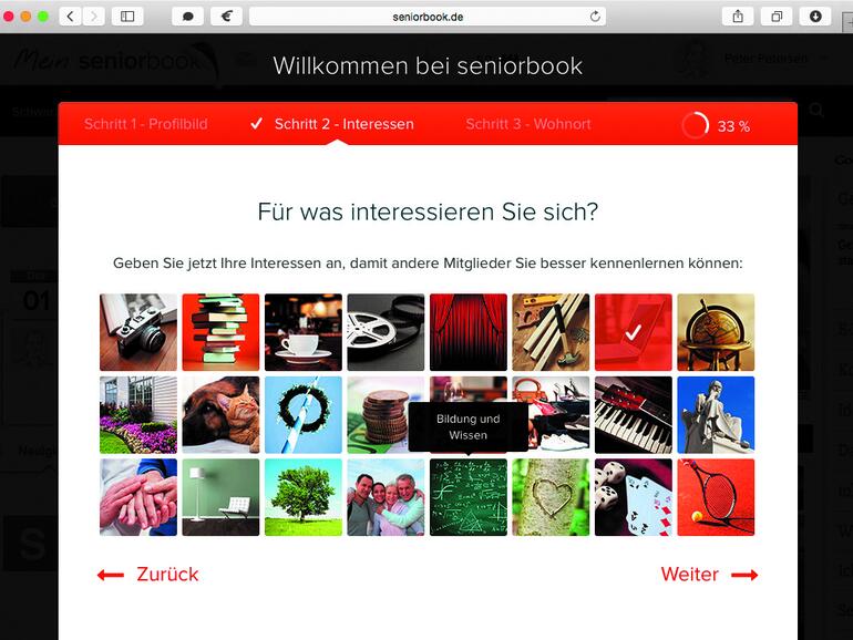 Nach dem Klick auf diesen Knopf wechseln Sie automatisch zurück auf die Seniorbook-Plattform. Hier können Sie nun Ihr Profil weiter ausfüllen. Im ersten Schritt fügen Sie Ihrem neuen Profil ein Foto hinzu. Klicken Sie auf „Foto auswählen“ und Sie können eine Bild-Datei von Ihrer Festplatte auswählen. Anschließend bestätigen Sie Ihr Foto mit einem Klick auf „Weiter“. Im zweiten Schritt geben Sie Ihre Interessen und Hobbys an. Zu Auswahl stehen unter anderem Computer & Technik, Bücher sowie Wohnen & Garten. Im dritten und letzten Schritt geben Sie Ihre Postleitzahl an. Damit vernetzen Sie sich leichter mit anderen Nutzern in Ihrer Umgebung. Nach der Anmeldung stehen Ihnen weitere Funktionen im Netzwerk zur Verfügung.