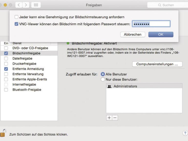 Öffne die Systemeinstellungen auf deinem Mac, um hier die „Freigaben“ aufzurufen. Hake in der Seitenleiste den Punkt „Bildschirmfreigabe“ ab. Im Hauptbereich wählst du daraufhin die Schaltfläche „Computereinstellungen“ aus. Im sich nun öffnenden Dialogfenster solltest du VNC-Viewern den Zugriff auf deinen Bildschirm gestatten und ein Passwort dafür vergeben. Dieses sollte sich nicht mit dem Kennwort decken, mit dem du dich in dein Mac-Benutzerkonto einloggst, falls dein iPad einmal in fremde Hände gerät.