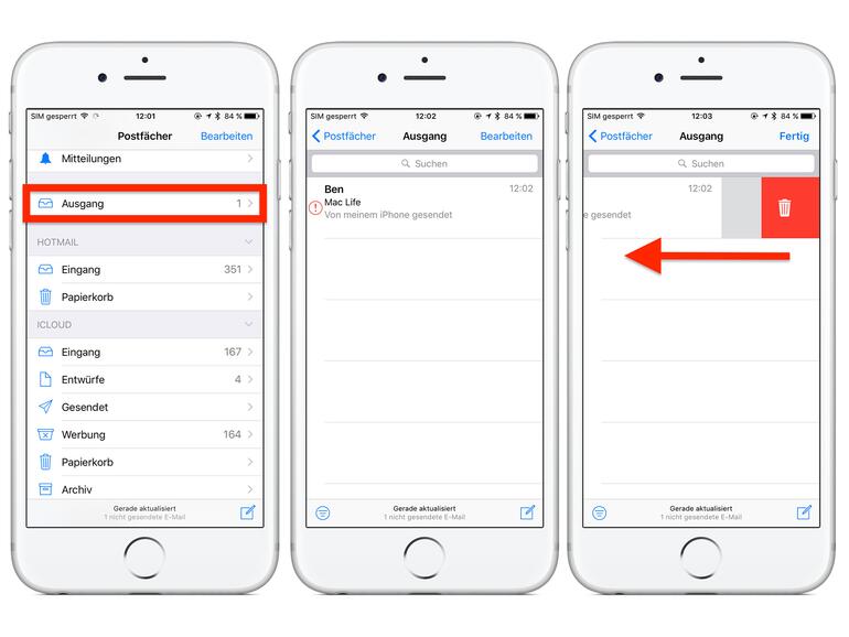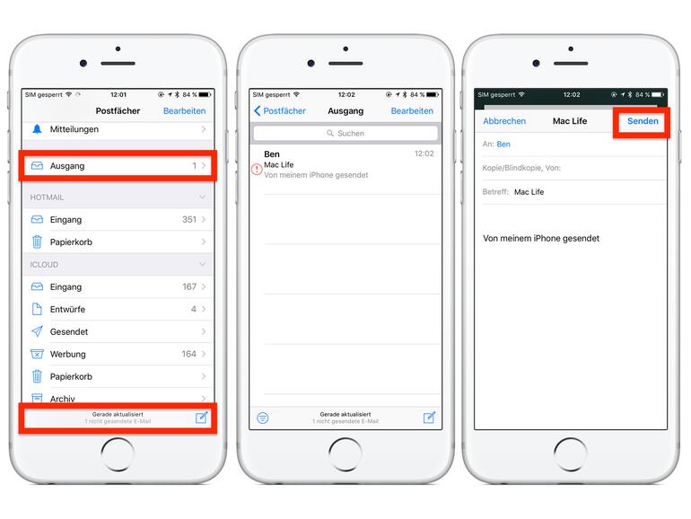 Öffnen Sie dazu die Mail-App und kehren Sie innerhalb der App zur Postfach-Übersicht zurück (Button oben links). Wählen Sie den „Ausgang“ aus und tippen Sie auf die ungesendete Mail. Diese wird mit einem rotem Ausrufezeichen angezeigt. Tippen Sie oben rechts erneut auf „Senden“.