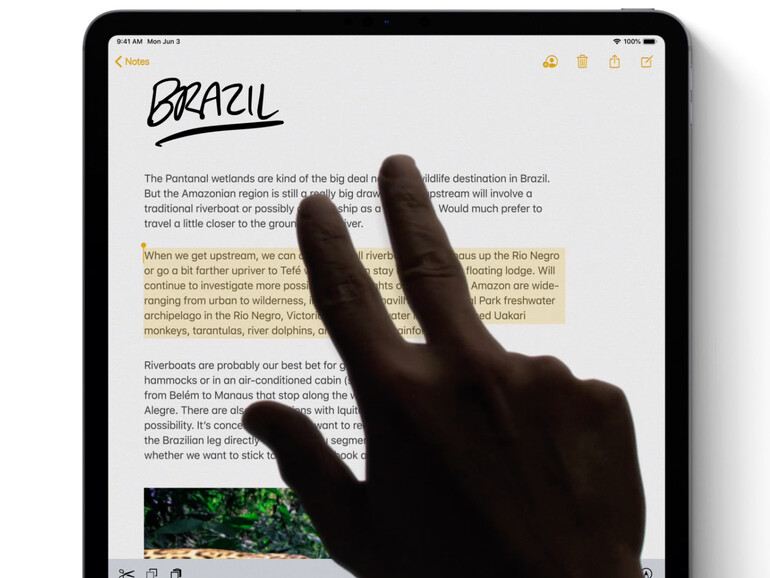 Die Textauswahl vereinfacht Apple mit iPadOS merklich, indem man zahlreiche neue Gesten und damit Möglichkeiten hinzufügte. Tippen und streichen Sie einfach über ein Wort, um es auszuwählen. Ist es ausgewählt, dann lässt es sich mit neuen Gesten kopieren, ausschneiden und an anderer Stelle wieder einfügen. Um Ihre Auswahl schnell zu kopieren, wischen Sie mit drei Fingern nach oben. Möchten Sie die Auswahl hingegen ausschneiden, dann wischen Sie gleich zweimal mit drei Fingern nach oben. Eingefügt wird Ihre kopierte oder ausgeschnittene Auswahl durch das nach unten Wischen mit drei Fingern. Nicht immer klappen die Gesten beim ersten Mal und erfordern etwas Übung.