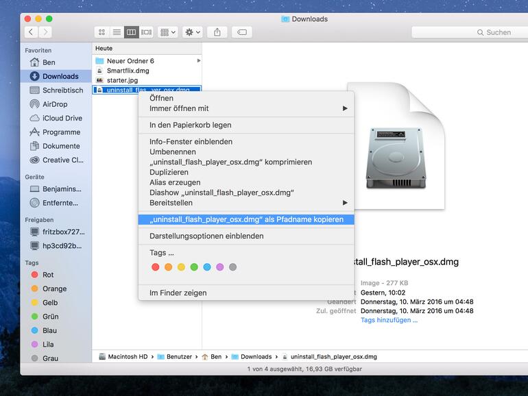 Hinweis: Wie bereits eingangs erwähnt kann, der Datei- beziehungsweise Ordnerpfad erst ab OS X 10.11 El Capitan auf die beschriebene Art und Weise kopiert. Bei älteren OS-X-Versionen ist dies leider nicht möglich.